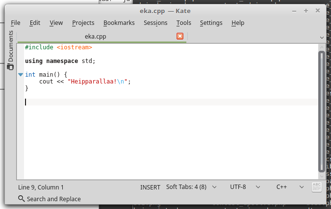 Tarvitset ohjelman kirjoittamiseen jonkin tekstieditorin. Esimerkiksi Linuxissa helppokäyttöinen editori on Kate, jossa on C++-koodin väritys. Ohjelma voi näyttää editorissa tältä: