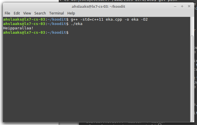 Seuraavaksi käymme läpi, miten saamme suoritettua tämän ohjelman Linuxissa. Jos käytät Macia, voit menetellä tätä ohjetta soveltaen. Jos käytät Windowsia, yksi suosittu ympäristö on Code::Blocks (valitse MinGW-asennus, niin saat samalla C++-kääntäjän).